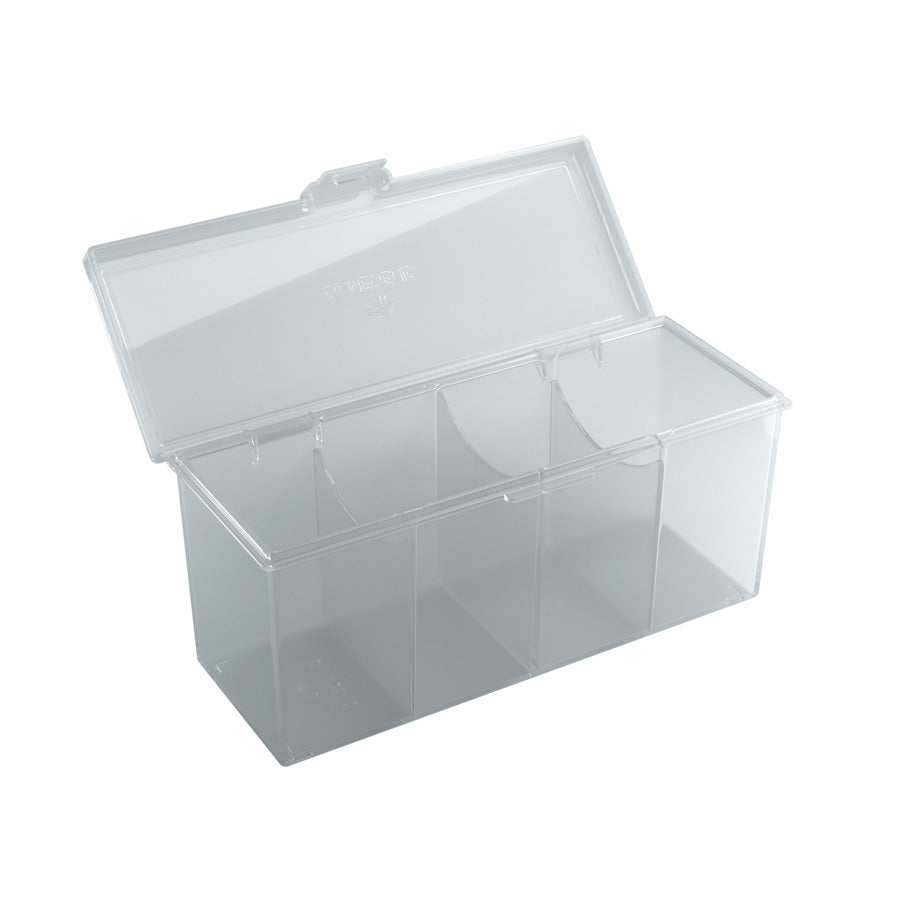 Full decks, dice, tokens or 320 double-sleeved cards: there is a lot that the Fourtress can hold and protect! This sturdy box is available in 5 different semi-transparent colors, allowing its contents to be easily identified. The integrated lock keeps it safely closed, while two inner walls can be removed to create bigger compartments. The boxes are stackable, so they are both perfect travel companions and a great storage solution at home.