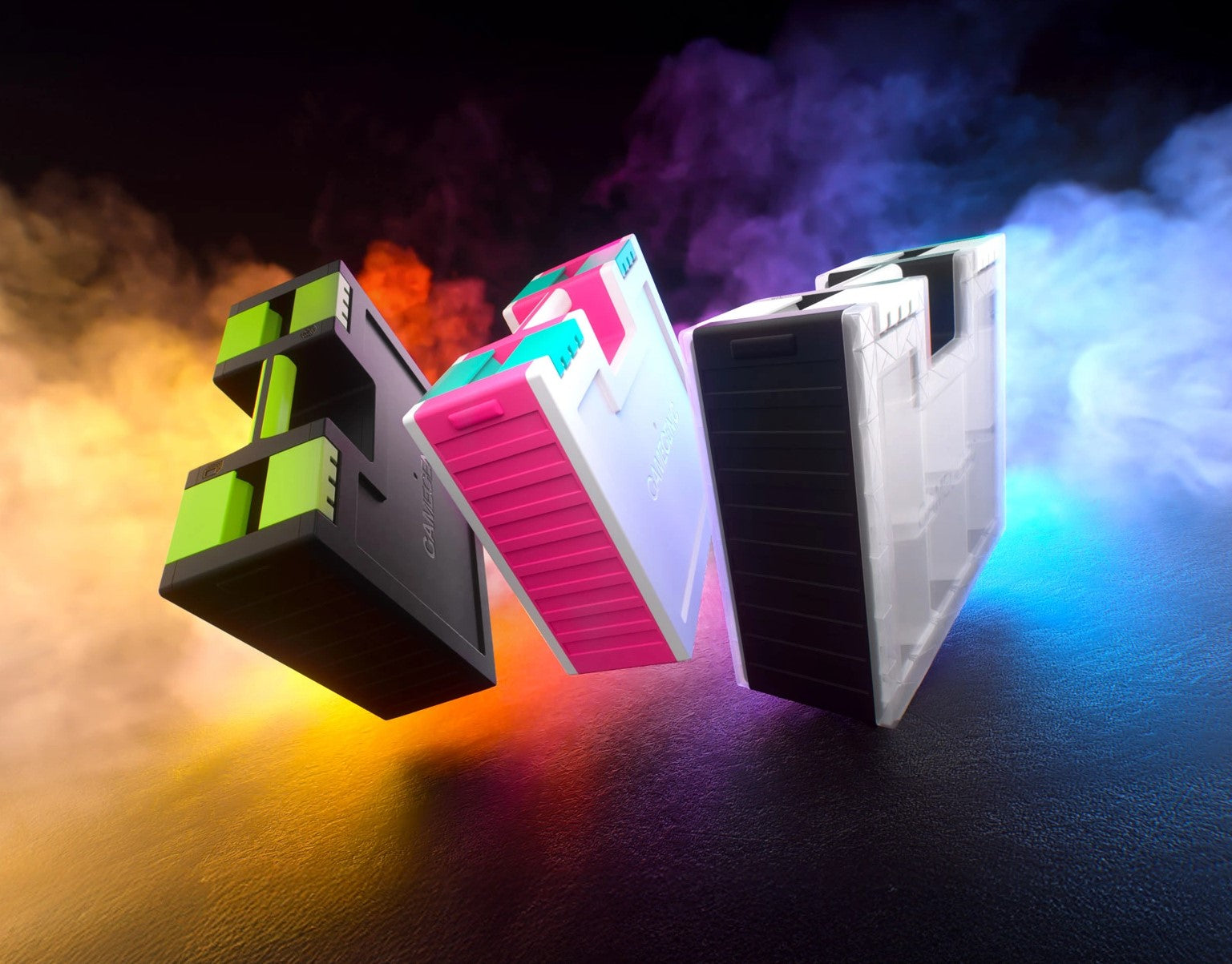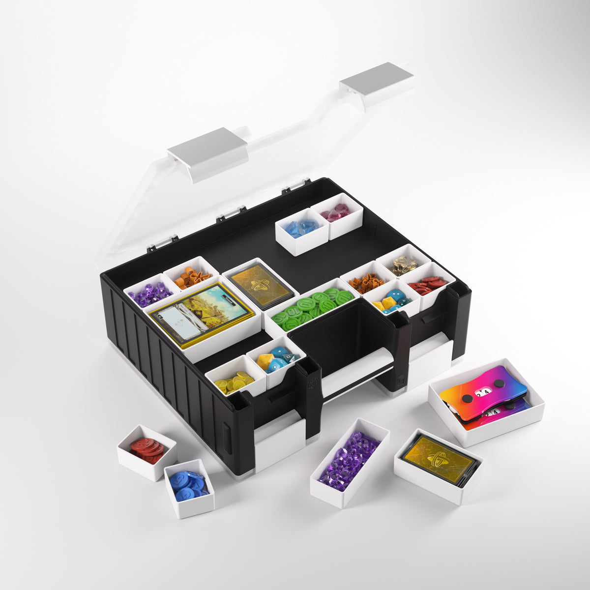 The Game Castle is a perfect storage solution for 6 Commander Decks (6x 100 double-sleeved cards), tokens, dice, movement/range tools, and many other gaming accessories! One side of the box houses six removable card holders for 600 double-sleeved cards in Thick Inner Sleeves or 800 board-game-sleeved cards. The other side holds 19 removable trays in 5 different sizes, including an extra-long tray to store movement/range tools, two trays in Mini-American card size, and two in Standard Card Game size. The trays can be swapped with those from the Gamegenic Token Silo, offering many different size and color combinations. The innovative clip mechanism ensures precise and secure closure.