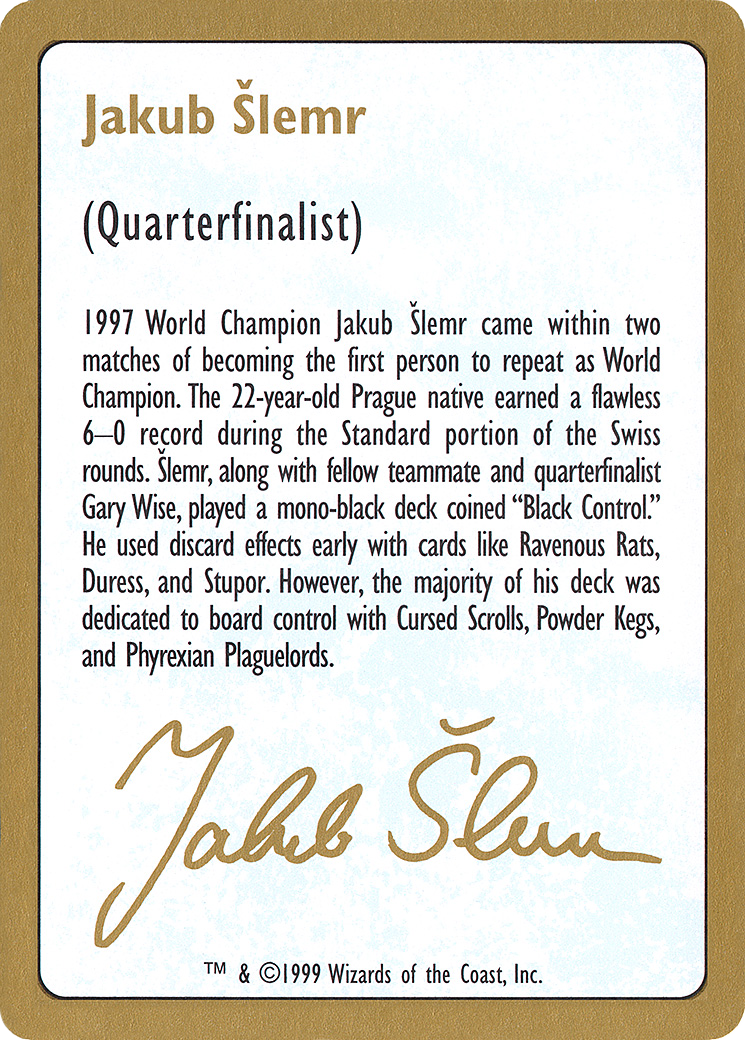 1997 World Champion Jakub Šlemr came within two matches of becoming the first person to repeat as World Champion. The 22-year-old Prague native earned a flawless 6—0 resord during the Standard portion of the Swiss rounds. Šlemr, along with fellow teammate and quarterfinalist Gary Wise, played a mono-black deck coined "Black Control." He used discard effects early with cards like Ravenous Rats, Duress, and Stupor. However, the majority of his deck was dedicated to board control with Cursed Scrolls, Powder Kegs, and Phyrexian Plaguelords.