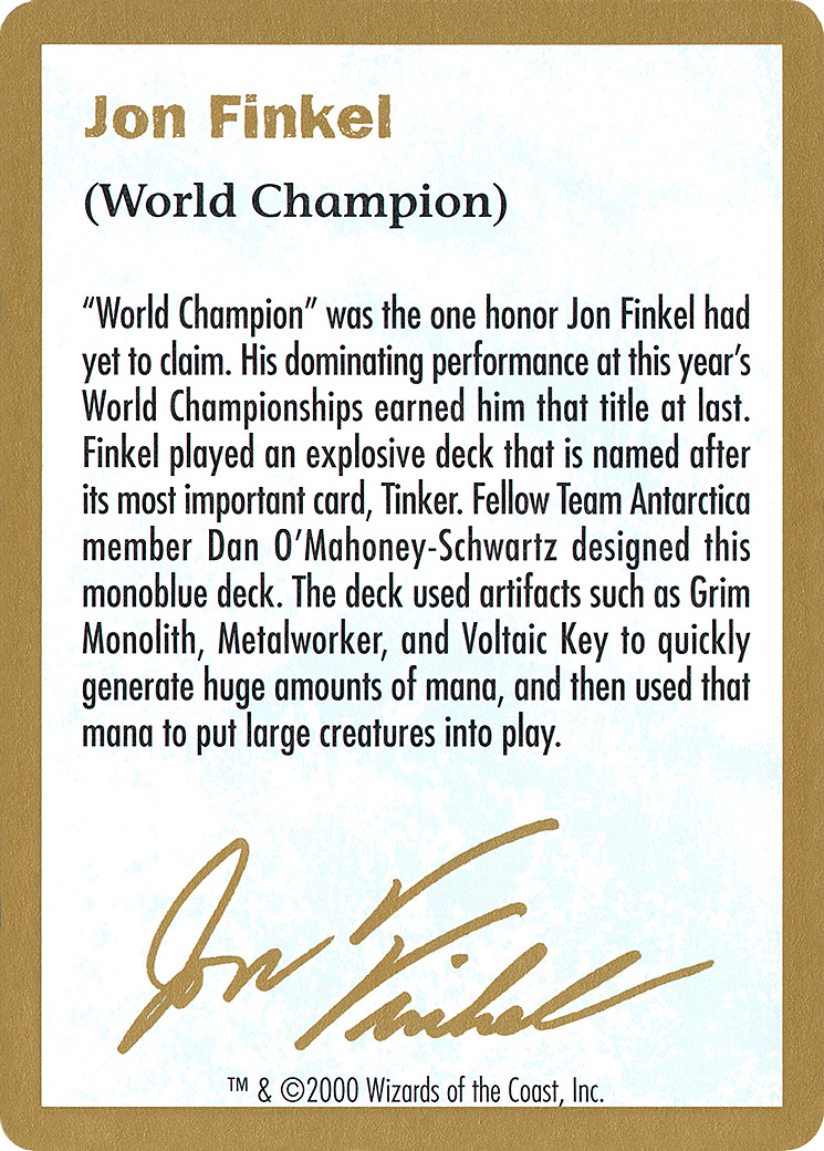"World Champion" was the one honor Jon Finkel had yet to claim. His dominating performance at this year's World Championships earned him that title at lost. Finkel played an explosive deck that is named after its most important card, Tinker. Fellow Team Antarctica member Dan O'Mahoney-Schwartz designed this monoblue deck. The deck used artifacts such as Grim Monolith, Metalworker, and Voltaic Key to quickly generate huge amounts of mana, and then used that mana to put large creatures into play.