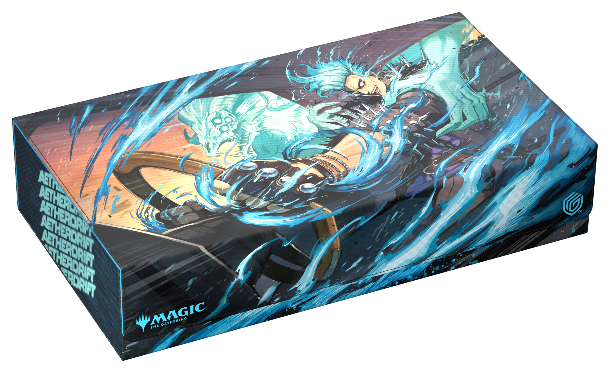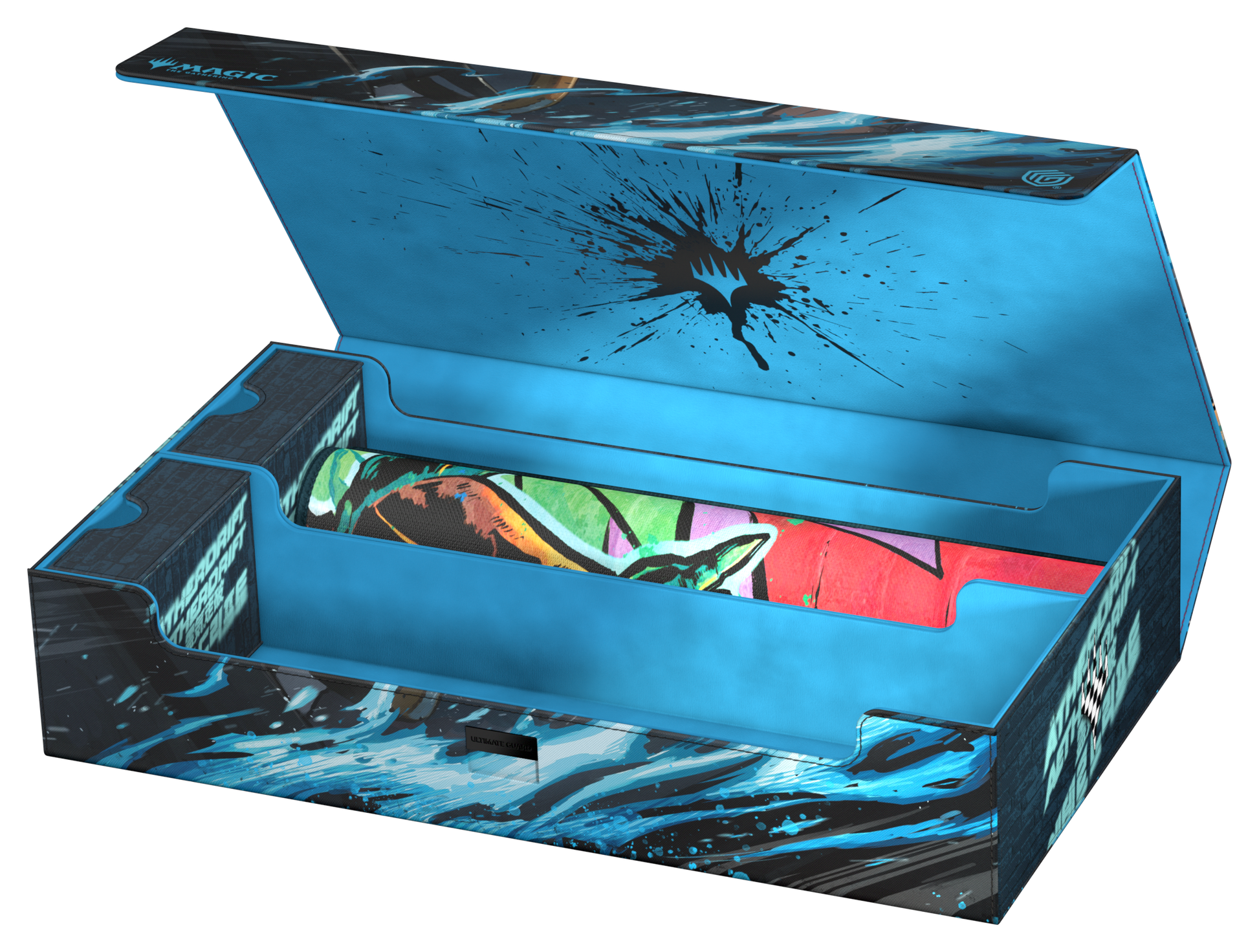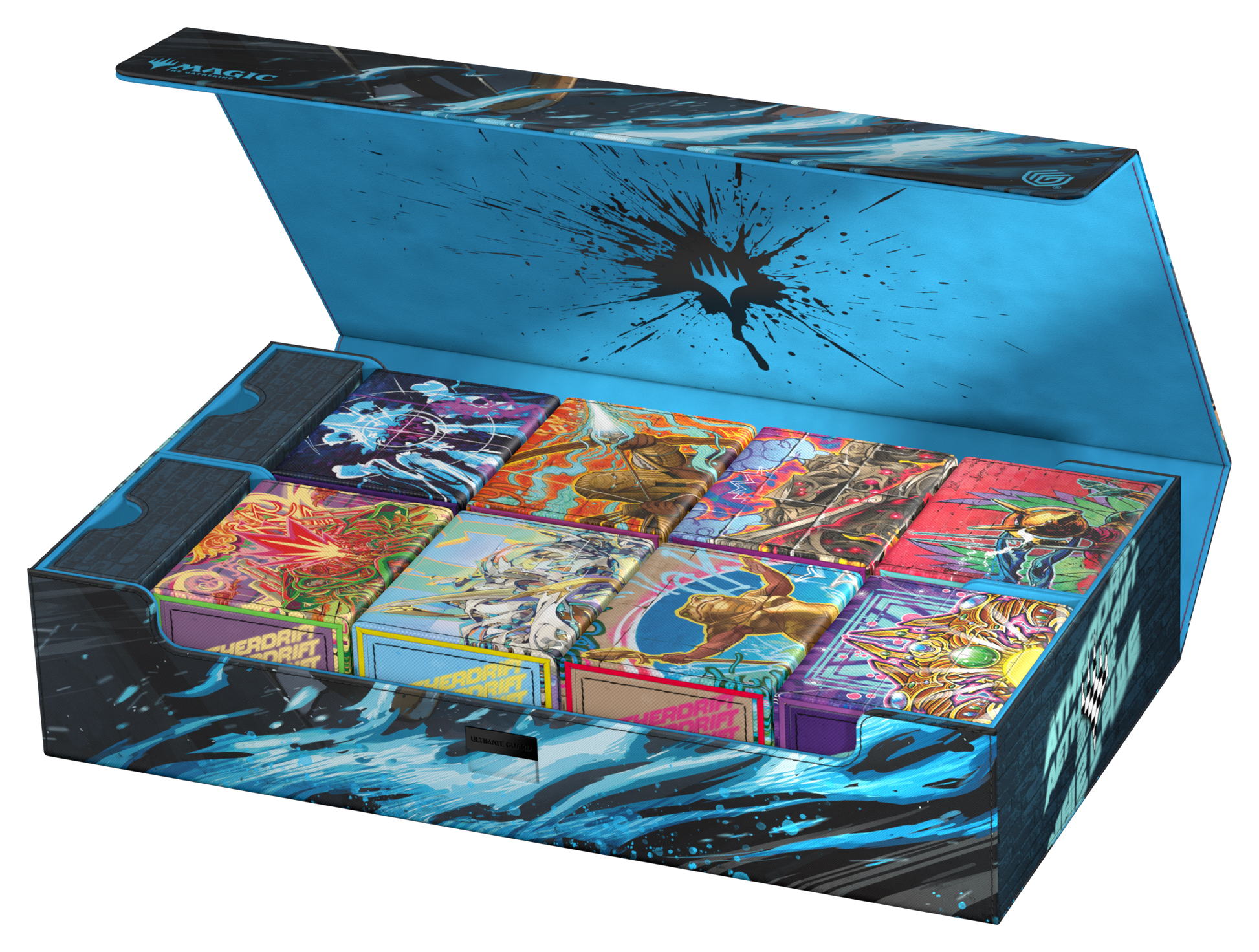 The Omnihive 1000+ Xenoskin is designed to hold multiple deck boxes, dice and/or playmats at once with the help of two flexibly positioned magnetic trays. The deck case, made of the popular and resistant Xenoskin material and printed with officially licensed art from Magic: The Gathering’s upcoming set “Aetherdrift”, is also the perfect choice for storing a larger collection of individual cards (up to 1000 double-sleeved). The Omnihive 1000+ Xenoskin’s inside is made of an elegant microfiber inner lining, while a strong magnetic closure with additional ZnapClaw mechanism ensures that cards and deck boxes are safe inside the box.