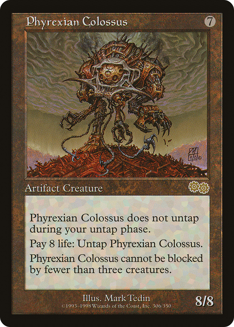 Phyrexian Colossus can't be blocked except by three or more creatures.