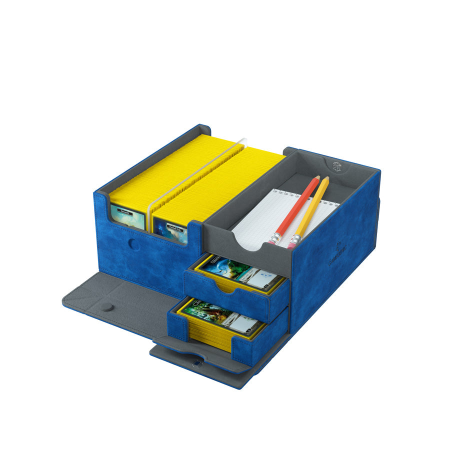 It contains a total of 4 drawers: 2 removable drawers with ingenious magnetic flaps for sleeved cards or tokens plus 2 additional extra-large trays for even more tokens, dice, accessories, etc. The top-level compartment of the Games’ Lair 600+ can be used for life pads, oversized cards, traditional writing pads, to store pen-and-paper accessories, etc.